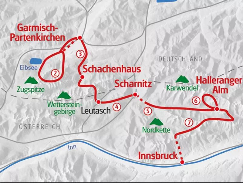 Sie durchqueren den Nationalpark Karwendel hinauf bis zur Nordkette, wo Sie mit der Seilbahn ins Tal nach Innsbruck schweben.