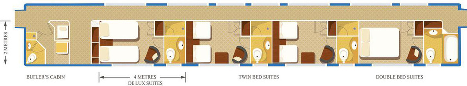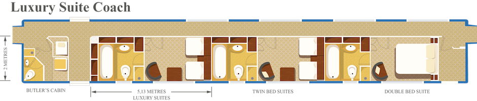 Die De Luxe Wagons verfügen jeweils über vier Suiten mit einer Größe von 4 x 2 Metern. Eines davon enthält ein Doppelbett und eine Badewanne der Größe ¾ mit Handbrause, während die anderen über Einzelbetten mit Dusche verfügen.