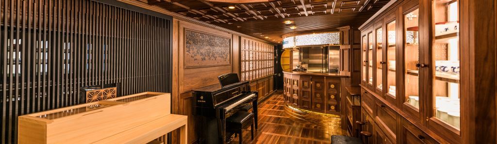 The Lounge Car “Blue Moon” is a saloon on wheels, where you can wind down during the day. At night, sip drinks at the bar and mingle with fellow passengers in the modern Japanese atmosphere as the pleasant sound of the live piano performance tinkles in the background. Enjoy the starry sky that peers in from the panoramic windows with a glass of bliss in your hand and relax on the sofas to take in the stunning views that pass by. This space provides the perfect setting for social gatherings as well as solo time.