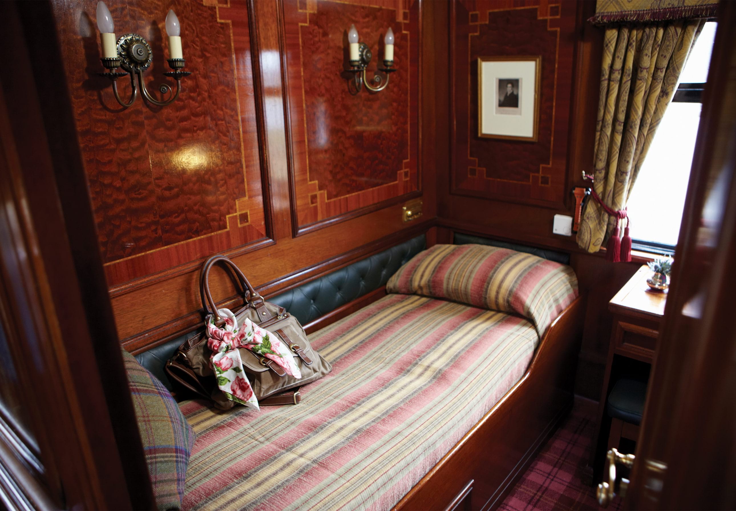 Nur 36 Passagiere nimmt der schottische Zug, der in seiner aktuellen Form erst seit 1990 auf Reisen geht und als einer der luxuriösesten Züge der Welt gilt, in opulent ausgestatteten Privatkabinen auf. Die edlen Doppel- und Einzel-Kabinen sind von Designer James Park mit Mahagoni-Täfelung, Tartan-Mustern und warmen Farbtönen im schottischen Flair der guten alten Zeit gestaltet. Neben Annehmlichkeiten wie Schminktisch, Ventilator und Klingel für den Kabinenservice besitzt jede Kabine ein eigenes Badezimmer – non-stop heisses Wasser, täglich frische extra-flauschige Handtücher und luxuriöse Toilettenartikel sind natürlich bei einem Zug dieser Klasse ein Muss. Für den Rundum-Blick auf pittoreske schottische Dörfer oder fotogene Schlossruinen besitzt der Royal Scotsman einen mit gemütlichen Sesseln ausgestatteten Panorama-Wagen, von dem aus die Gäste auch ins Freie treten können, um auf der Plattform die klare schottische Luft zu geniessen oder Sterne zu zählen.