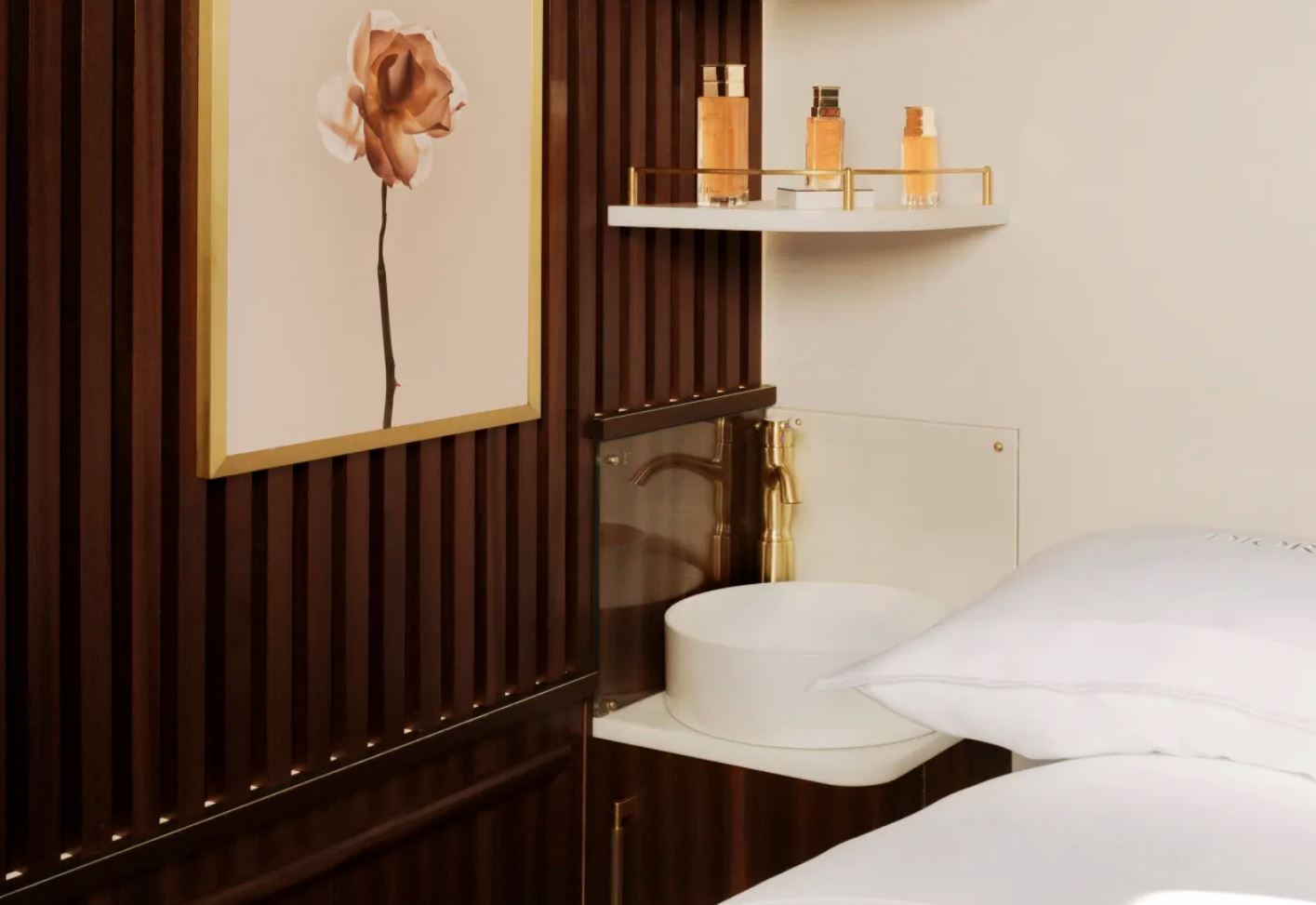 Ein aufgeräumtes Behandlungsliegen-Setup mit damastartiger Abdeckung, botanischen Wandmotiven, Waschbecken und elegant arrangierten Dior-Produkten lädt Sie ein, sich zu entspannen und verwöhnen zu lassen.