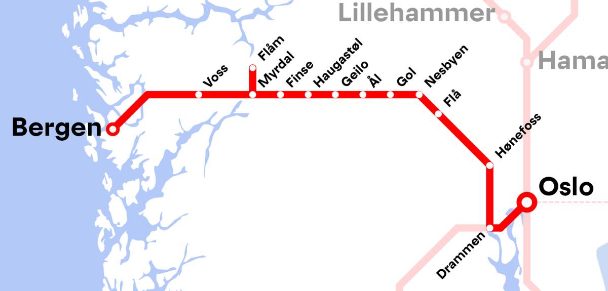 Historisch geht die Bahnstrecke, die sowohl bei ihrer Fertigstellung als auch in der heutigen Instandhaltung insbesondere im Winter nicht unkompliziert ist, auf das Bestreben zurück, die wichtigsten zwei Handelsstädte - Bergen und Stockholm - der damals vereinigten Königreiche Norwegen und Schweden zu verbinden. Nach der Unabhängigkeit Norwegens von Schweden 1905 änderte man die Pläne in die Verbindung der beiden wichtigsten Städte Norwegens. Die Bahnlinie wurde 1909 freigegeben, womit zum ersten Mal eine relativ schnelle Reise zwischen den beiden Orten möglich war. 1941 wurde die Nebenstrecke zum Sognefjord, die Flåmsbahn vom auf 866 m gelegenen Myrdal in das über 800 m tiefergelegene Flåm am Aurlandsfjord eröffnet. Bis dahin hatten Reisende, die per Schiff über den Aurlandsfjord angereist waren, zu Fuss oder Pferde den beschwerlichen Weg des Rallarvegens hinauf auf die Hochebene auf sich nehmen müssen.